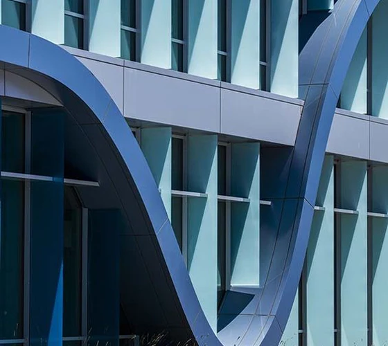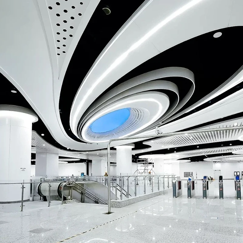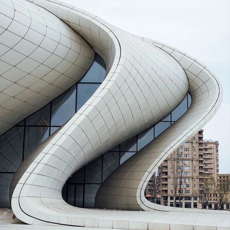 Hyperbolic Aluminum Veneer, also known as irregular aluminum veneer or curved aluminum sheet, is a type of building decoration material that has been processed into complex hyperbolic shapes through special techniques. It is made of aluminum alloy sheet through precision forming technology, and the surface can be treated with spraying, film coating, etc. to meet the requirements of weather resistance, aesthetics, and personalized design