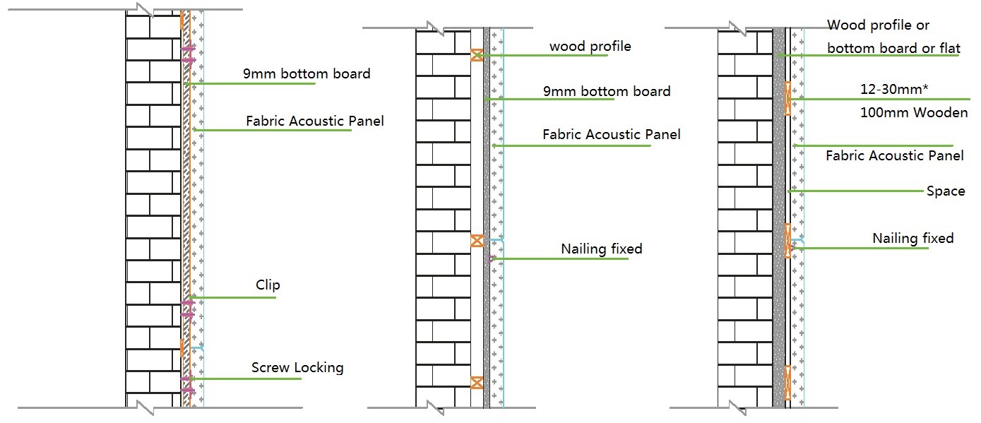 Fabric acoustic panels is made from high density fiberglass woolinside with resin frame,wood frame or aluminum frame around and wrapped with fire retardant fabric leather outside.The various colors and finish choices can meet all the customer’s acoustic and decoration requirements.
